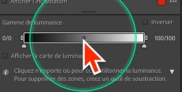 Appui sur « Option ou alt » pour afficher la carte de luminance, par défaut en rouge les zones impactées par le réglage, si bien qu’on va réduire de part et d’autre pour exclure les zones déjà sombres en avant plan et exclure les zones de surexposition de l’image.