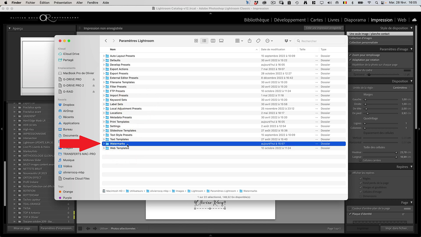 En cliquant ensuite sur le bouton “Afficher tous les paramètres prédéfinis de Lightroom”, vous ouvrirez le dossier contenant justement ces paramètres. Il est situé au même niveau que votre catalogue mais dans celui-ci, vous trouverez les “watermarks” qui sont en fait vos signatures.