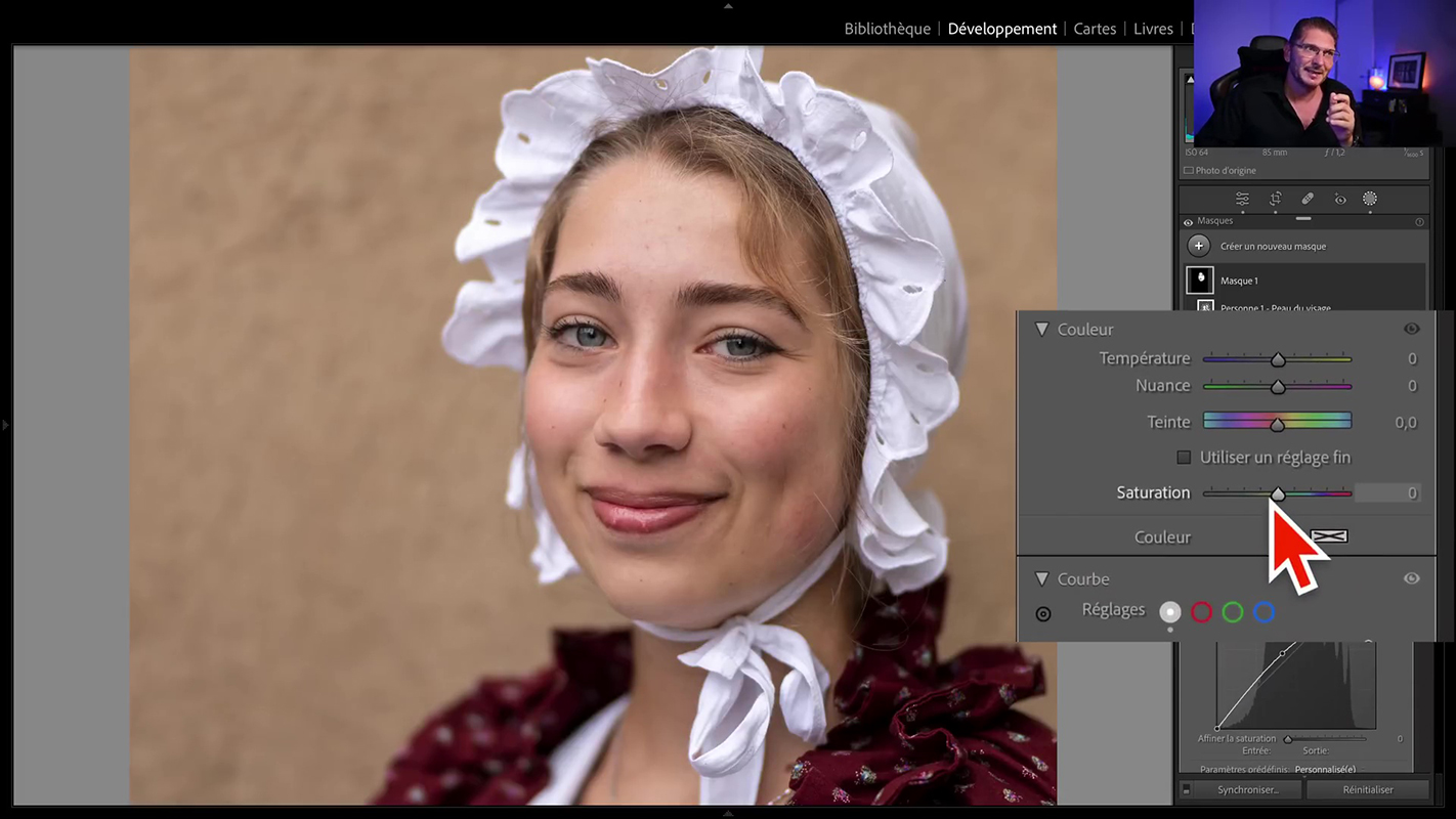 Pour ce deuxième exemple, j’utilise une photo de portrait. En effet, toute personne ayant déjà eu recours au traitement Dodge and burn sur un masque de peau sait pertinemment qu’il faut sans arrêt jongler entre la luminosité et la saturation. Par conséquent, je crée un masque du visage. Puis, j’utilise l’outil Cible de la courbe des tonalités pour remonter légèrement les tons les plus sombres du visage. Ensuite, je réalise la même opération pour baisser doucement les tons les plus clairs.
