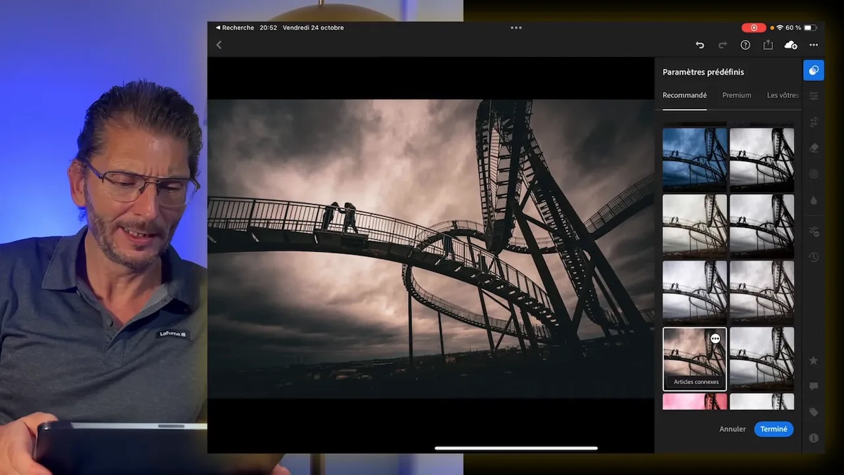 Une fois synchronisées, les collections sont visibles dans Lightroom Mobile et Lightroom sur iPad. Les aperçus dynamiques sont rapatriés depuis le cloud vers l’application sans occuper d’espace permanent sur l’appareil. Je peux parcourir les images, faire des sélections, retoucher et appliquer des profils ou des préréglages.
