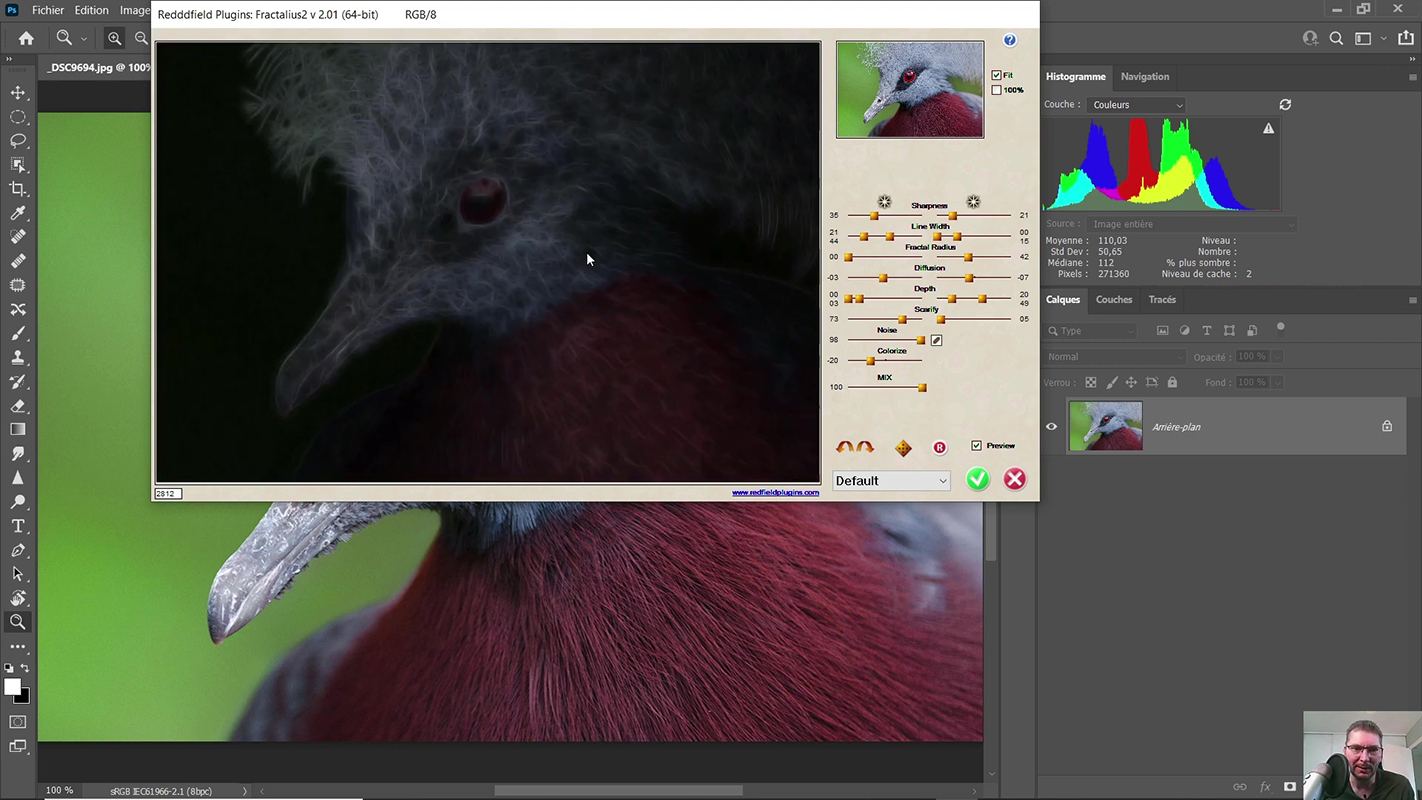 Je lance Fractalius 2 et vous voyez l’interface de ce plugin sur la photo ci-contre. Tout de suite, il nous applique un effet assez sympa d’ailleurs. La documentation de Redfield du plugin est inexistante. Vous ne trouverez nulle part les informations relatives à ces différents curseurs. Il y a très peu d’informations à ce sujet donc j’ai réalisé pas mal de tests sur tous les curseurs. De ce fait, ce que je vais tenter de vous expliquer ici n’est peut-être pas la vérité absolue. c’est donc basé sur mon expérience et ce que j’ai cru comprendre de l’utilité de tel ou tel curseur.