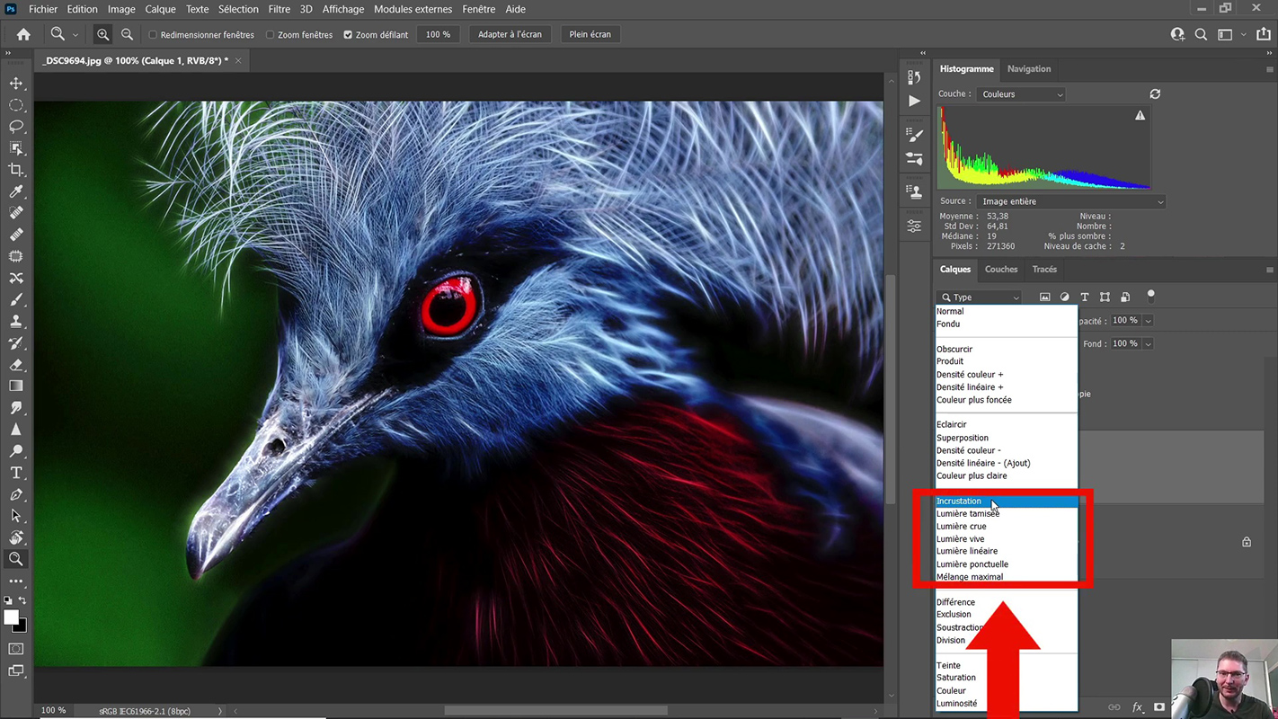 A ce stade, nous avons notre image originale et celle avec notre effet par-dessus. On peut déjà jouer sur la fusion entre les deux images simplement en changeant les modes de fusion. Il suffit pour cela d’aller dans les différents modes de fusion (voir photo ci-contre).