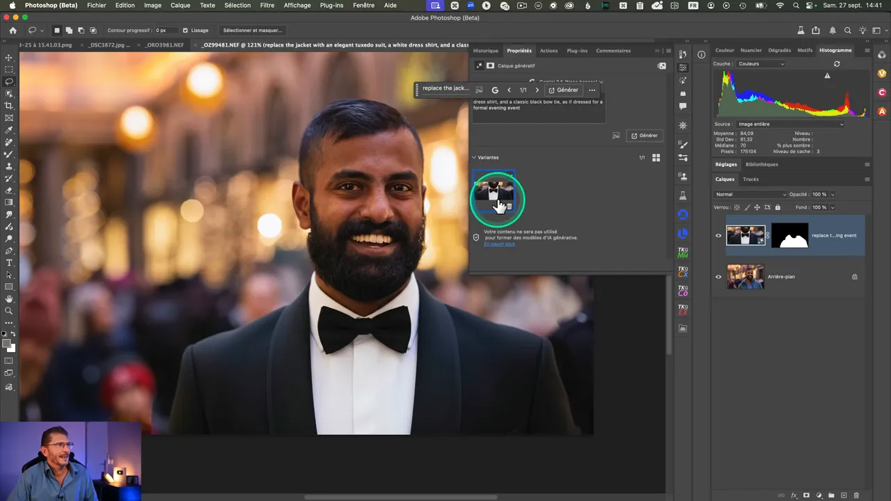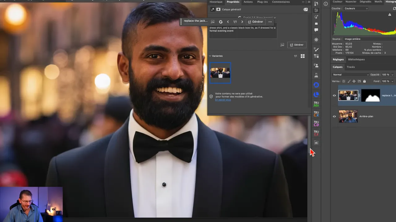 - J’ai écrit le prompt en anglais car je constate souvent de meilleurs résultats. Exemple : « replace the jacket with an elegant tuxedo suit, a white dress shirt ».