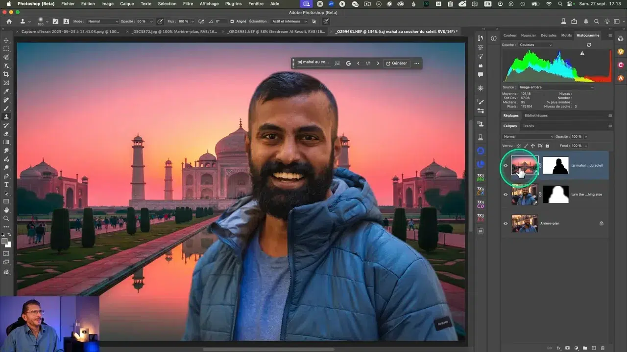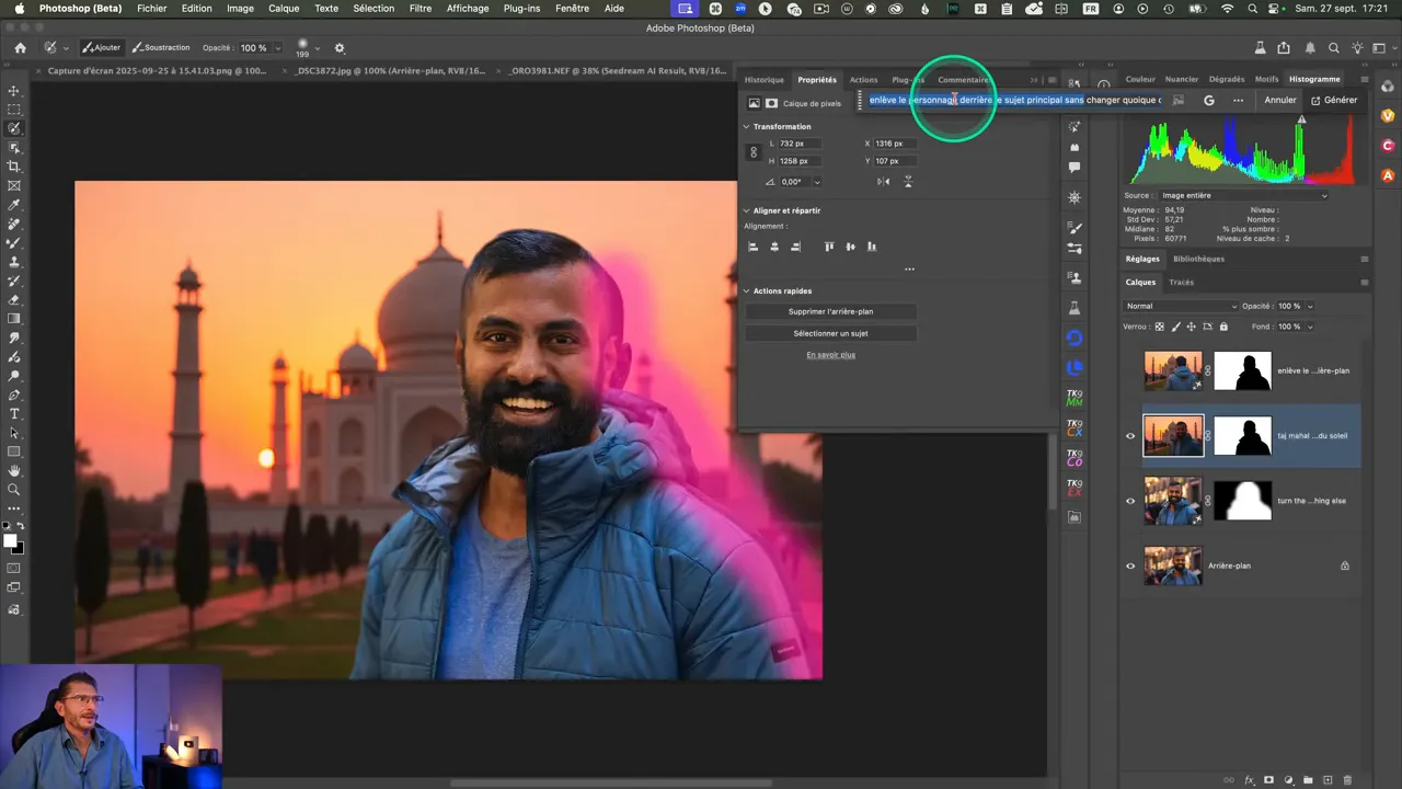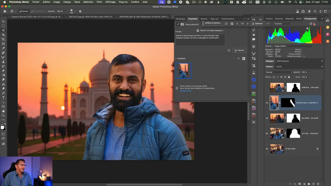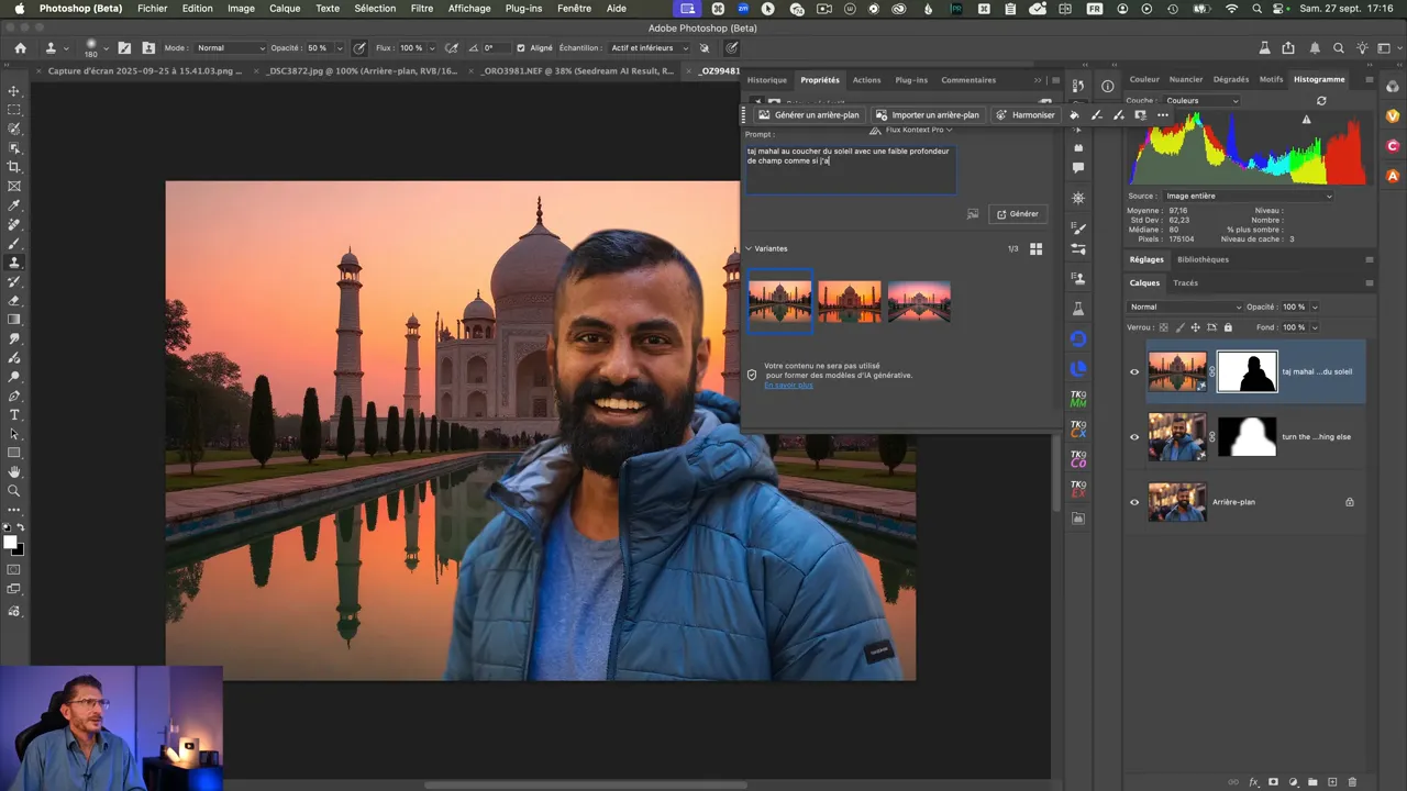 - Prompt : « homme devant le Taj Mahal au coucher du soleil » pour expliciter le maintien du sujet, car au premier essai avec uniquement « Taj Mahal au coucher du soleil », le personnage avait été effacé.
