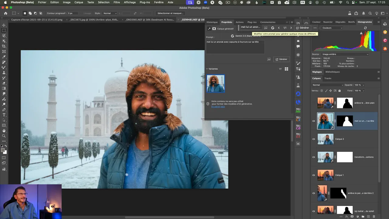 Compte tenu de mes constatations, je modifie le sujet : je sélectionne le personnage puis je demande à Nano Banana de l’habiller plus chaudement (anorak avec capuche à fourrure). Le résultat est plutôt décevant et irréaliste, mais c’est parce que je n’ai pas laissé de place autour du sujet pour que l’IA comprenne le contexte et utilise la zone supplémentaire.