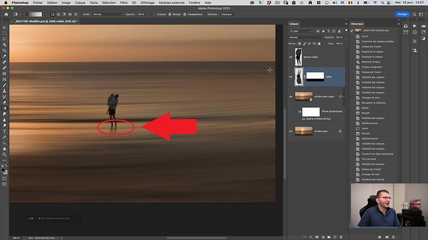 Dans l’image originale, le reflet est assez flou. C’est pourquoi, nous allons faire de même dans la reproduction. Pour cela, vous allez dans l’onglet Filtre → Flou → Flou directionnel (ou gaussien). Puis, je décide de faire réapparaître les pieds de l’homme qui disparaissent un peu trop dans le sable.