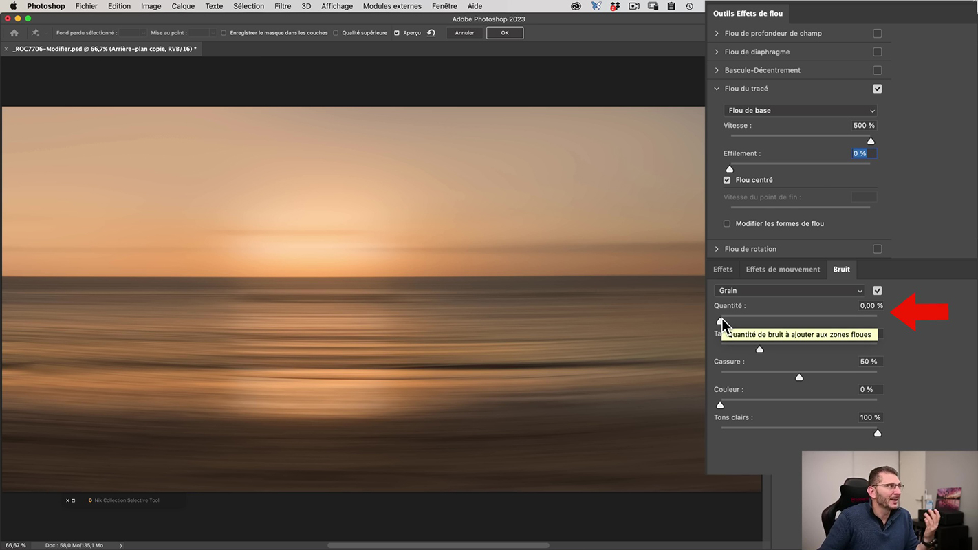A noter que vous avez également un onglet Bruit. Lorsque vous flouter alors qu’il y a du bruit dans l’image originale, c’est intéressant d’ajouter un peu de grain pour qu’elles coïncident parfaitement. Vu que nous ne conservons que les personnages dans cet exemple, ce n’est pas utile. Cependant, si vous conserviez d’autres éléments de la photo, il y aurait des différences entre des endroits tout lisses et d’autres avec plus de grain.