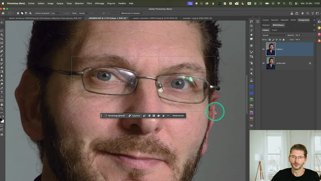 • Lancer le Remplissage génératif et saisir le prompt : Remove reflections from the glasses.